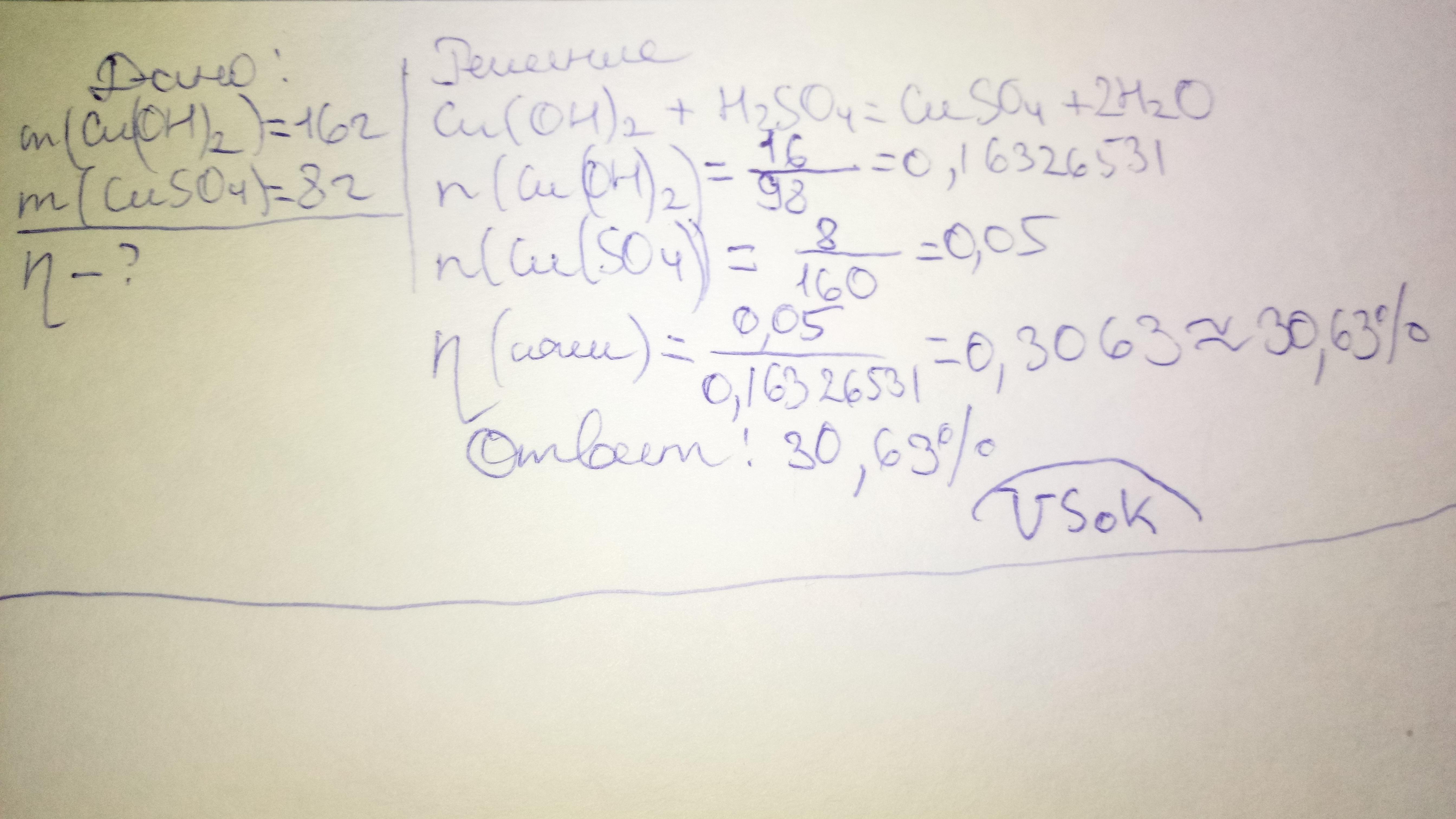 гидроксид меди реагирует с серной кислотой. масса гидроксида 16г, масса полученной соли равна 8г. найти выход соли