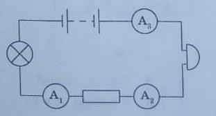 Все амперметры включены последовательно в цепь с лампочкой и звонком. При последовательном соединении через все сопротивления и амперметры течет один и тот же ток.