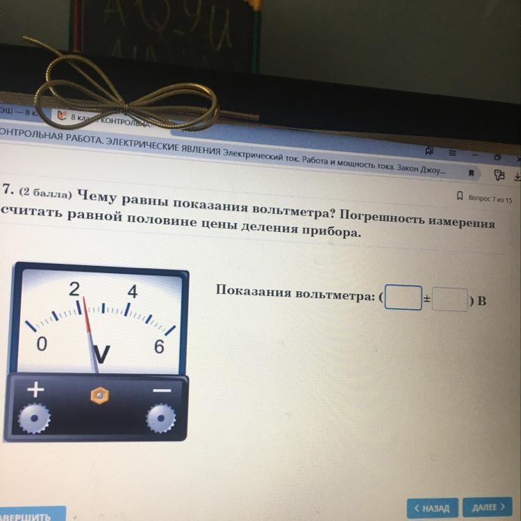Вольтметр показывает 2,2В. Цена деления равна 0,2В. Так как погрешность составляет половину от цены деления, то она равна 0,1В.