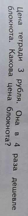 Цена тетради 3 рубля. Она в 4 раза дешевле блокнота. Сколько будет стоить тетрадь и блокнот вместе?