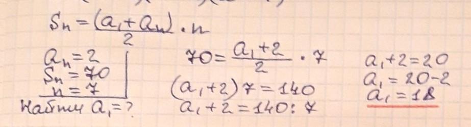 Сумма первых n членов арифметической прогрессии вычисляется по формуле Sn=(a1+an)2⋅n. Пользуясь этой формулой, вычисли значение a1, если an=2, Sn=70, n=7.