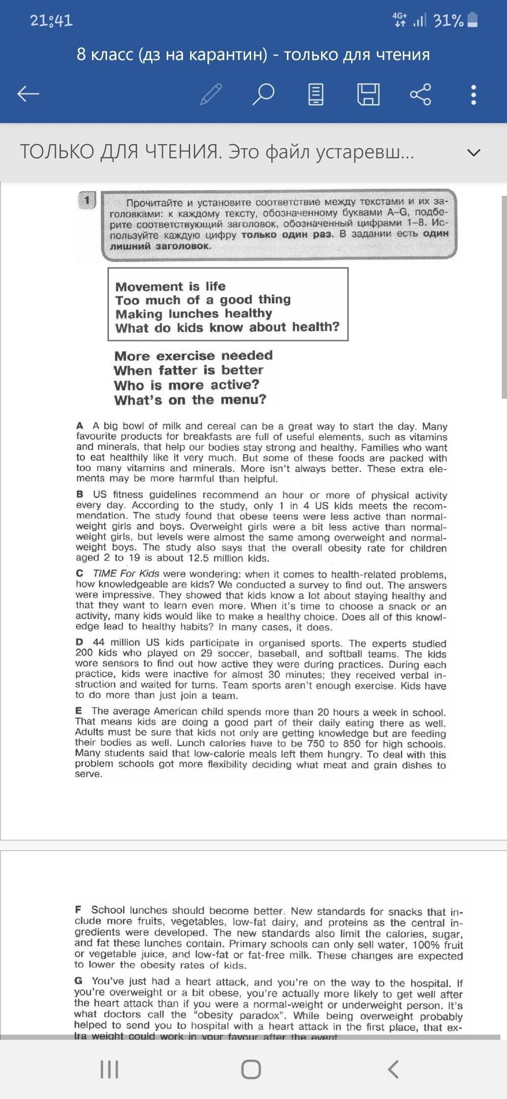 Прочитайте тексты и установите соответствие между текстами и их заголовками: к каждому тексту, обозначенному буквами A–G, подберите соответствующий заголовок, обозначенный цифрами 1-8. Используйте каждую цифру только один раз. В задании есть один лишний заголовок.