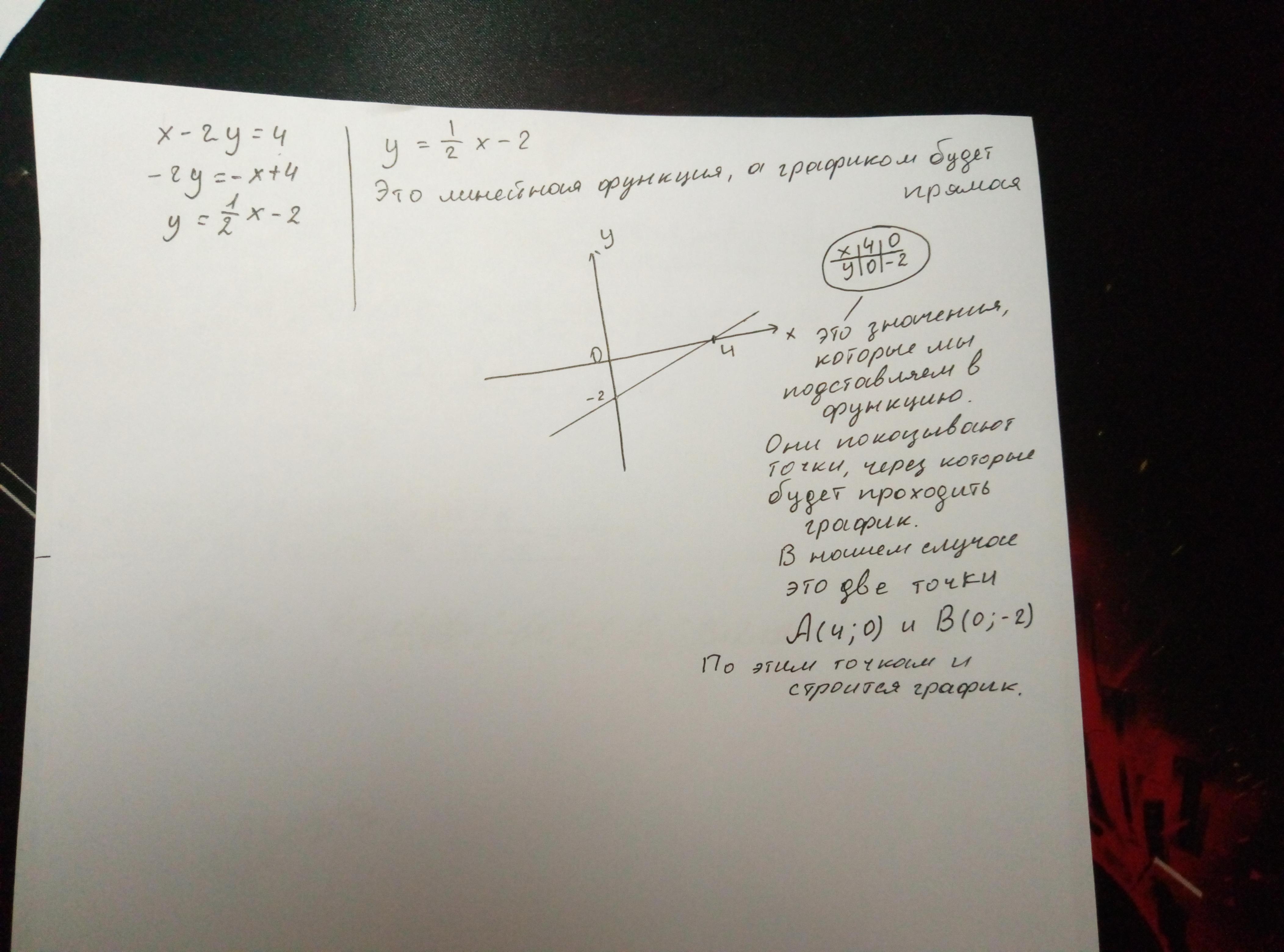 у=(х-4)/2, это уравнение функции, график которой нужно построить.
