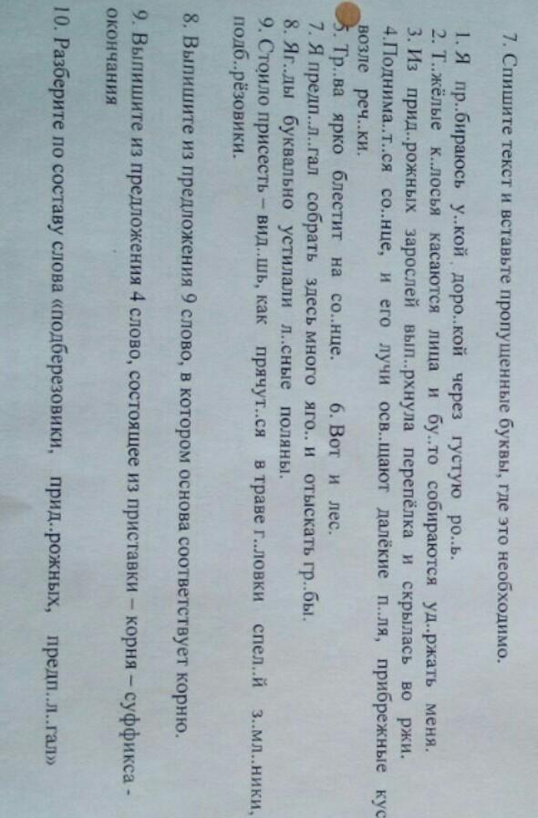 Ответ:8.видишь 9.прибрежные 10.под приставка берез корень ов и ик суффиксы и окончанчие подберезовик основа, при приставка дорож корень н суффикс ых