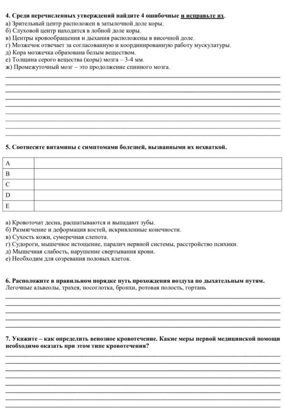 -слуховой центр находится в в сочной доле, в-центры дыхания и кровообращения расположены в продолговатом мозге, д- кора образована серым веществом, ж-продолговатый мозг является продолжением спинного. 5) про витамины. А-в, В-г, С-а, D-бд, Е-е. 6) ротовая полость, носоглотка, гортань, трахея, бронхит, альвеолы. 7)венозное кровотечение можно определить по крови темно-бордового цвета, непрерывно вытекающего из раны. Его можно остановить, обработав рану 1-2% раствором перекиси водорода и наложив тугую, давящую повязку