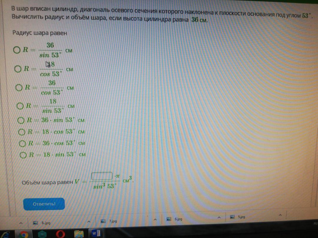 R=h/(2sin53°)=36/(2sin53°)=18/sin53° см радиус шара