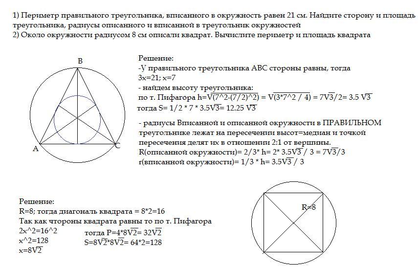 1) Периметр правильного треугольника, вписанного в окружность равен 21 см. Найдите сторону и площадь треугольника, радиусы описанного и вписанной в треугольник окружностей