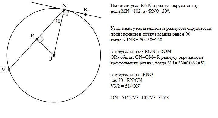 Вычисли угол RNK и радиус окружности, если MN= 102, а ∢RNO=30°.