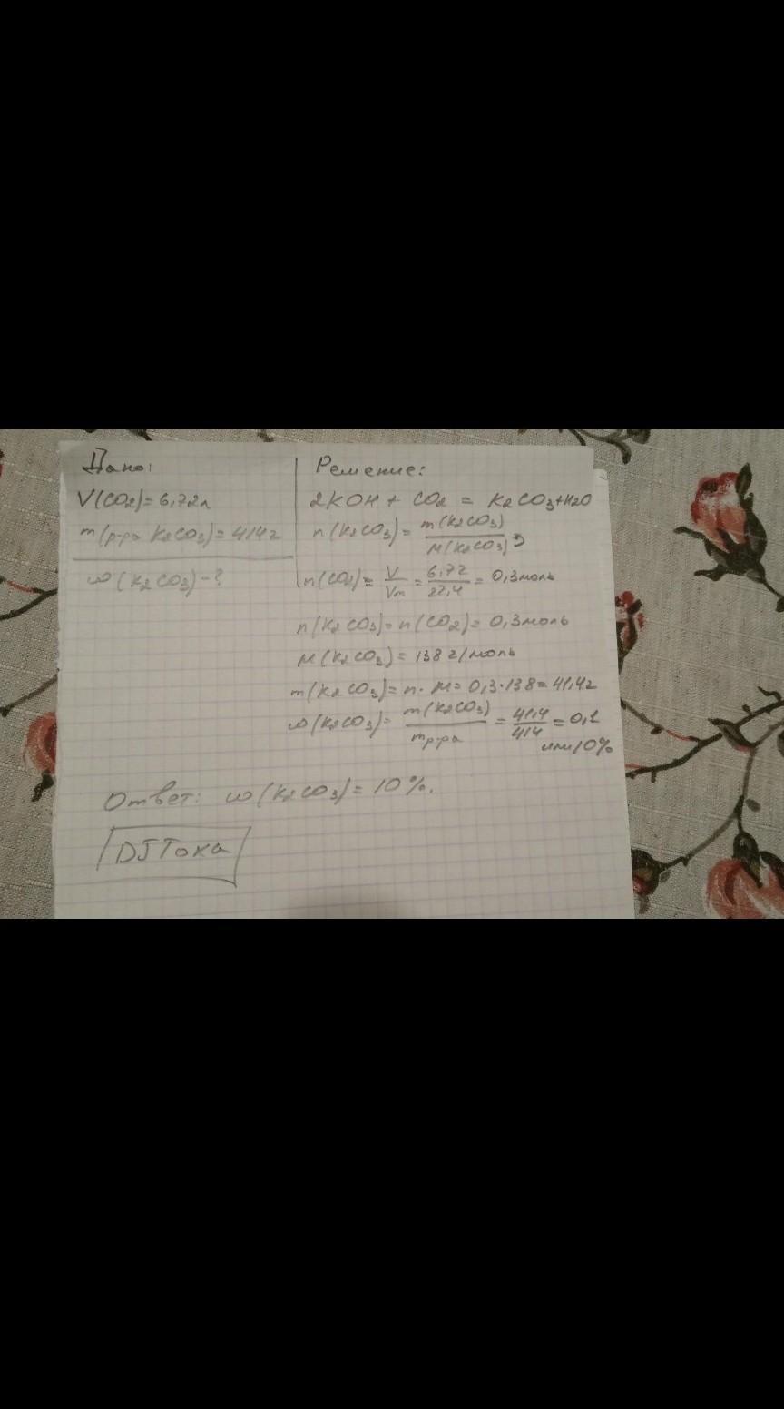 После пропускания через раствор гидроксида калия 6,72 л углекислого газа (н. у.) получили 414 г раствора карбоната калия. Вычислите массовую долю соли в полученом растворе.