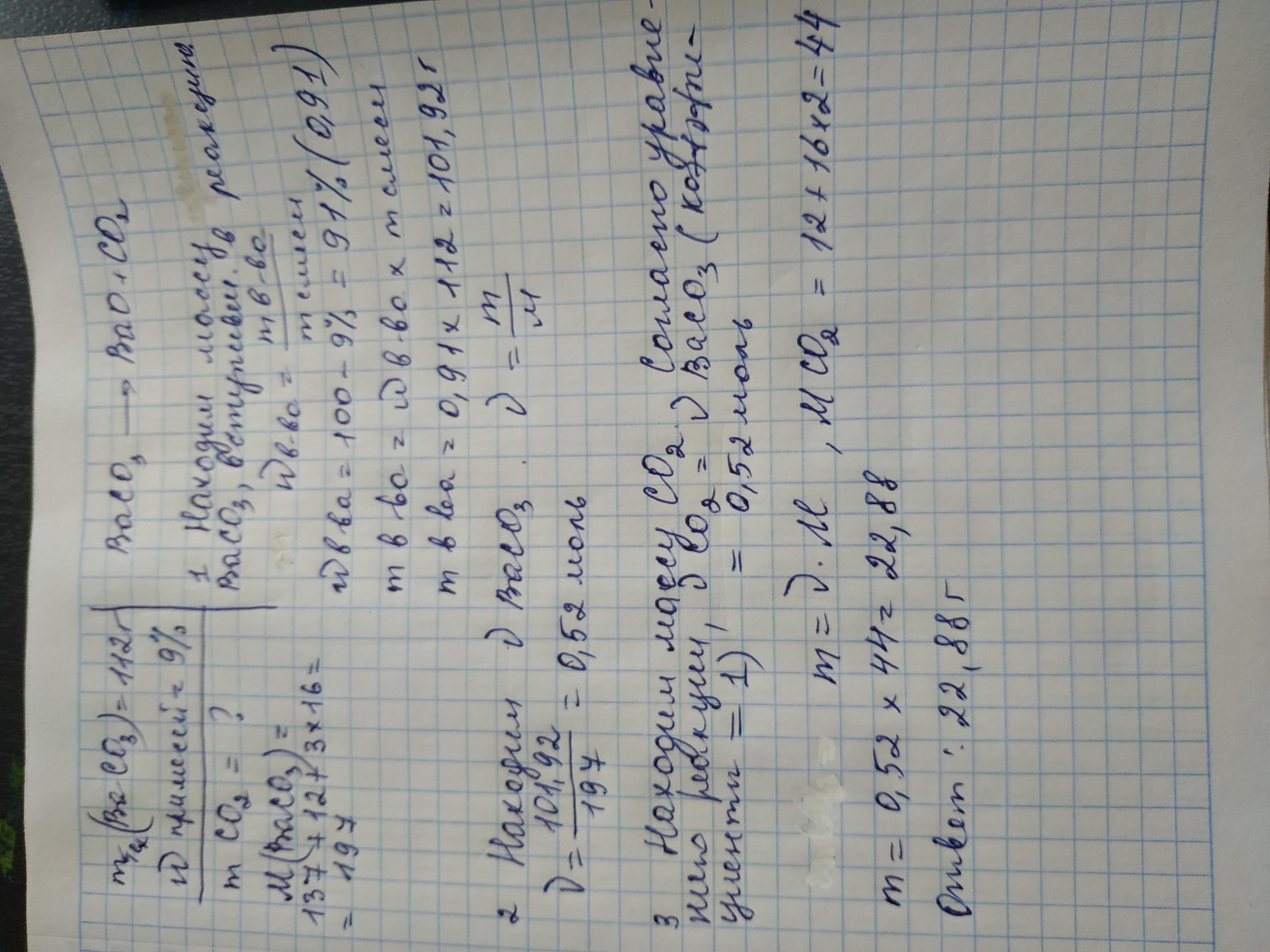 ) (в г), которая выделится при обжиге 112 г технического карбоната бария, содержащего 9 % примесей.