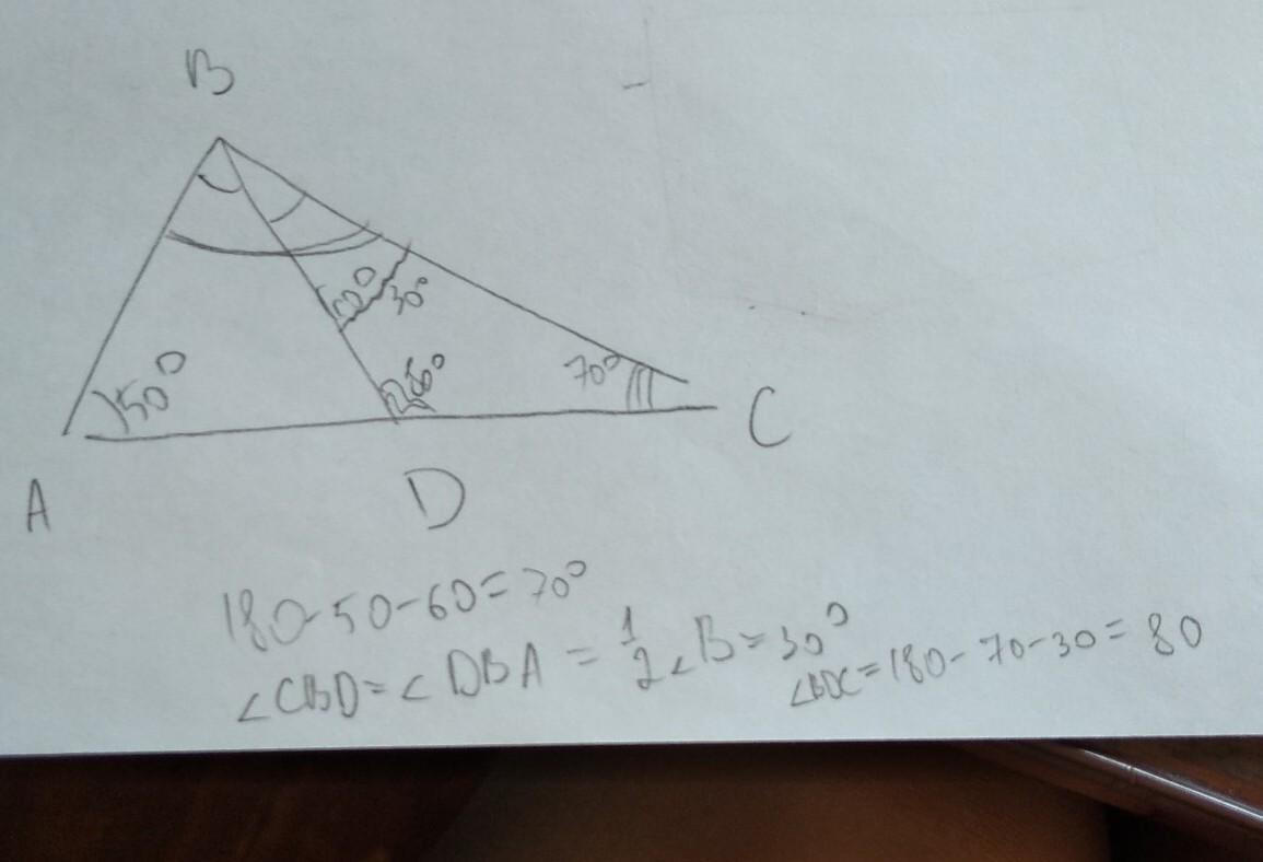 У трикутнику ABC проведено бісектрису BD. кут А=50°, кут В=60°. Визначте кути трикуиника CBD