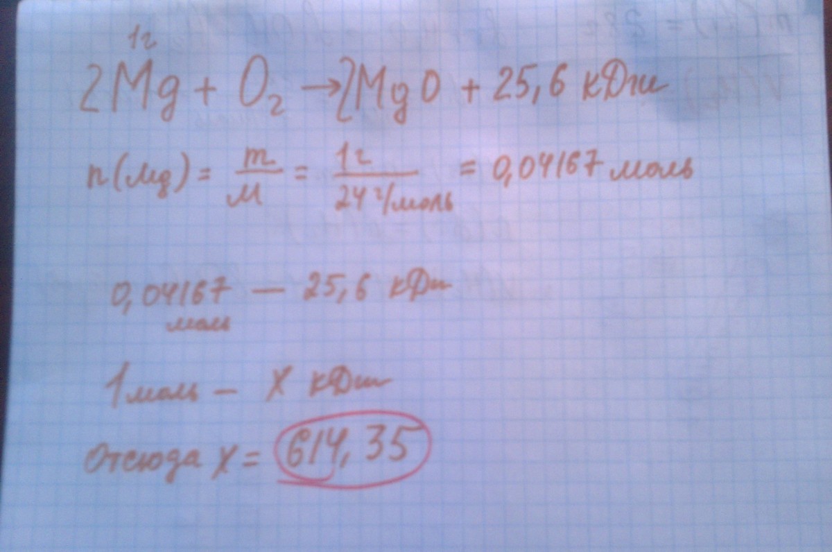 Составьте термохимическое уравнение, если известно, что при сгорании 1 грамма магния выделяется 25,6 Кдж теплоты. Значение теплового эффекта горения магния (из уравнения реакции) запишите с точностью до целых (без единиц измерения):