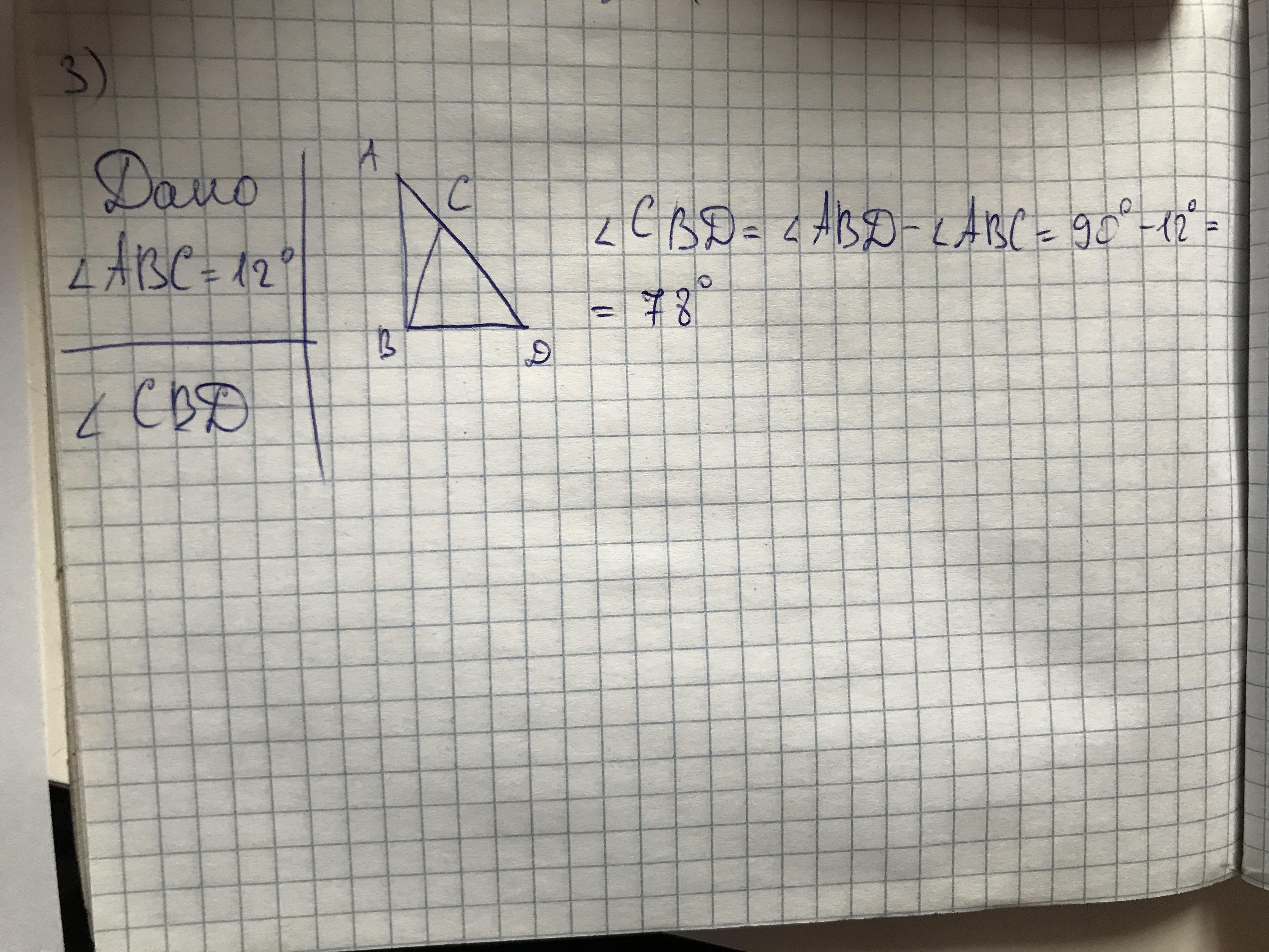 Сделай соответствующий рисунок и найди угол CBD, если угол ABC равен 12°.