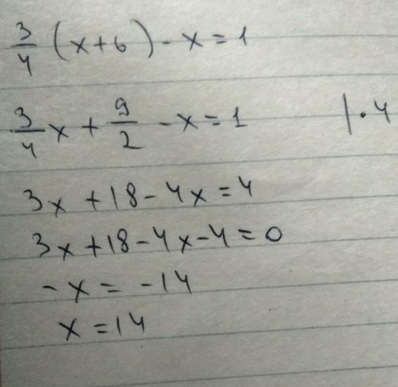3/4 × (x+6) - 1×x = 1