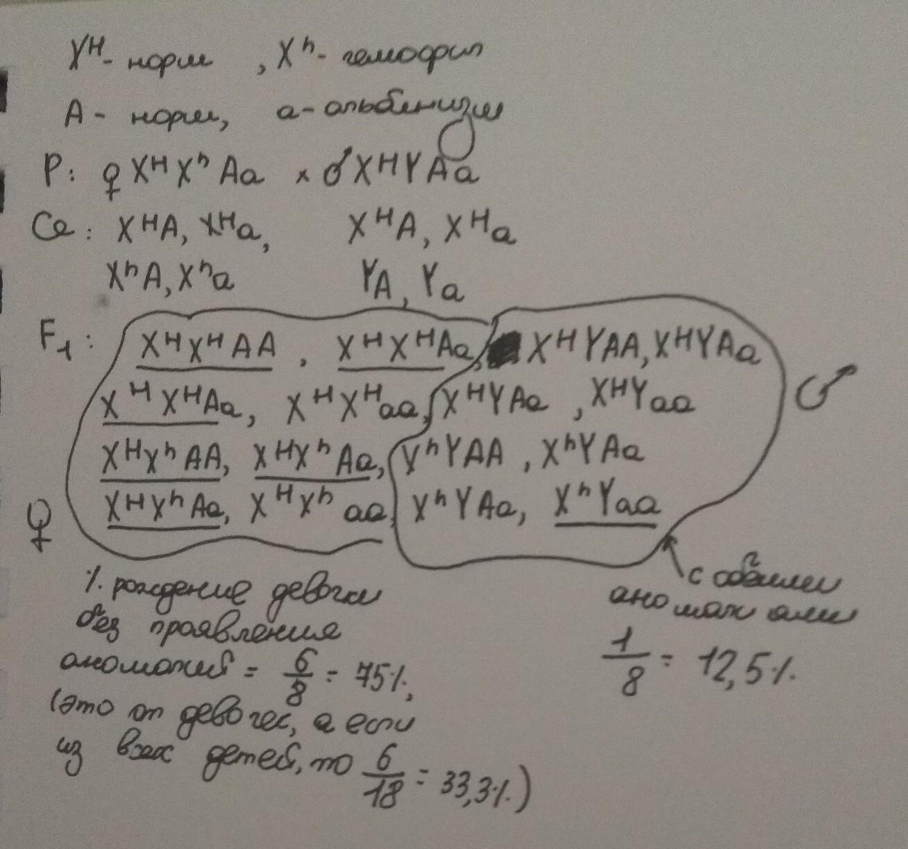 У человека гемофилия (h) - рецессивный, сцепленный с Х-хромосомой признак. Альбинизм обусловлен аутосомных рецессивным геном. В одной семье, где мужчина и женщина нормально пигментированные и имеют нормальную свертываемость крови, родился сын с обеими аномалиями. Составьте схему решения задачи. Добавить генотипы родителей. Какой может быть вероятность проявления обоих аномалий у второго сына? Какой может быть вероятность рождения в следующий раз девочки с нормальной пигментацией и нормальным свертываемостью крови?
