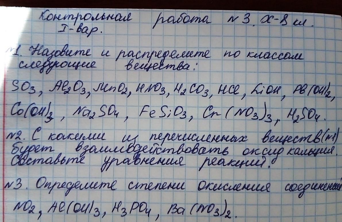 Задание 2) CaO+SO3=CaSO4. CaO+Al2O3=Ca(AlO2)2. CaO+MnO2=CaMnO3. CaO+2HNO3=Ca(NO3)2+H2O. CaO+H2CO3=CaCO3+H2O. CaO+2HCl=CaCl2+H2O. CaO+H2SO4=CaSO4+H2O. Задание 3). NO2- у азота +4, у кислорода-2. Al(OH)3-у алюминия +3, у гидрокси группы -. H3PO4- у водорода+3, у кислорода-2, у фосфора +5. Ba(NO3)2- у бария +2, у кислорода - 2, у азота +5