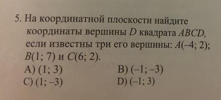 накреслити награфіку точки що відомі і варіанти відповідей якщо з'єднати точки і вийде квадрат.