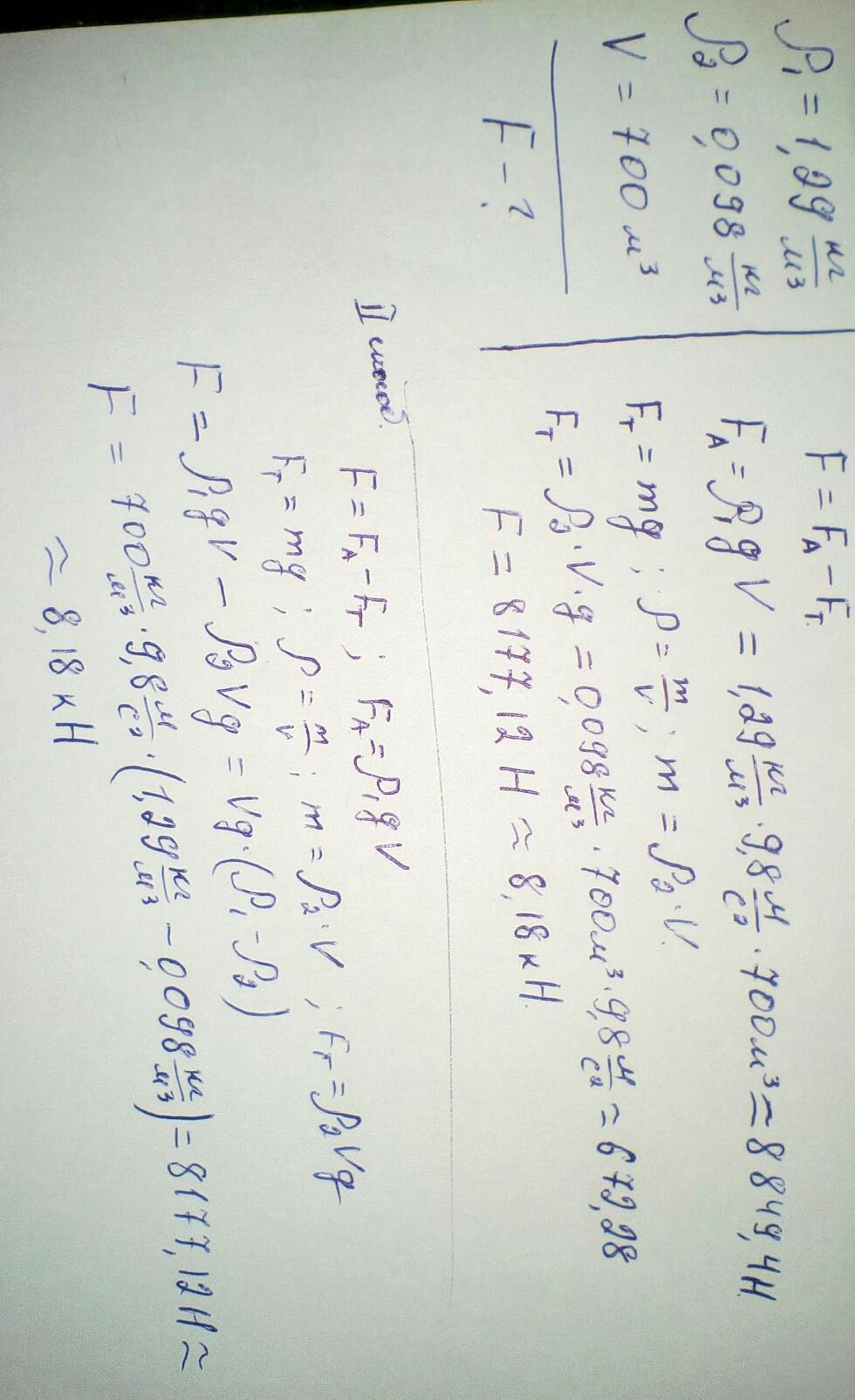 Считая, что плотность воздуха равна 1,29кг/м³, а водорода — 0,098 кг/м³, найди
