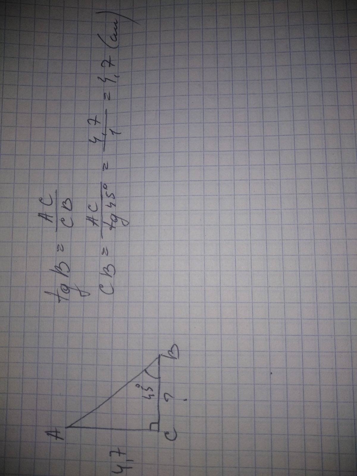прямоугольный прямоугольник АВС, угол В равен 45 градусов, угол С равен 90 градусов, СА равен 4,7 см, найти угол СВ