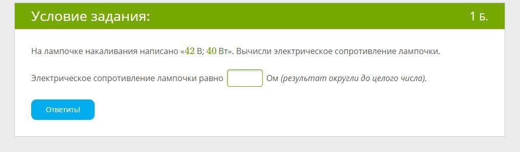 На лампочке накаливания написано «42 В; 40 Вт». Вычисли электрическое сопротивление лампочки.