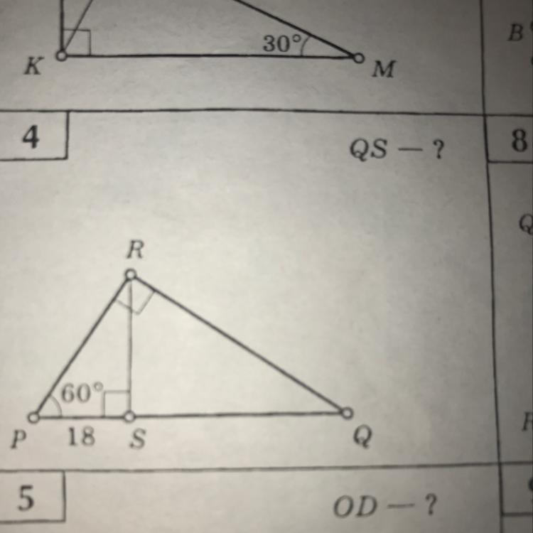 90-60=30 т.к треугольник прямоугольный. Напротив угла 30° лежит катет, равный половине гипотенузы. Отсюда 18*2 = 36. Треугольки PRS и QRS подобны. Сторона PR общая. Угол Q также 30°. Значит 36*2=72-это сторона PQ. 72-18=54