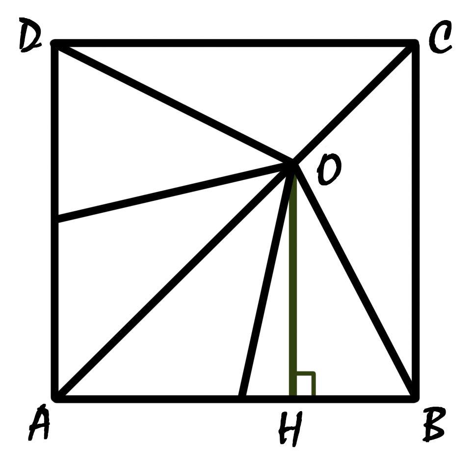 Квадрат ABCD площади 81 состоит из шести треугольников одинаковой площади ( см. рисунок). Чему равно расстояние от точки O до стороны AB?