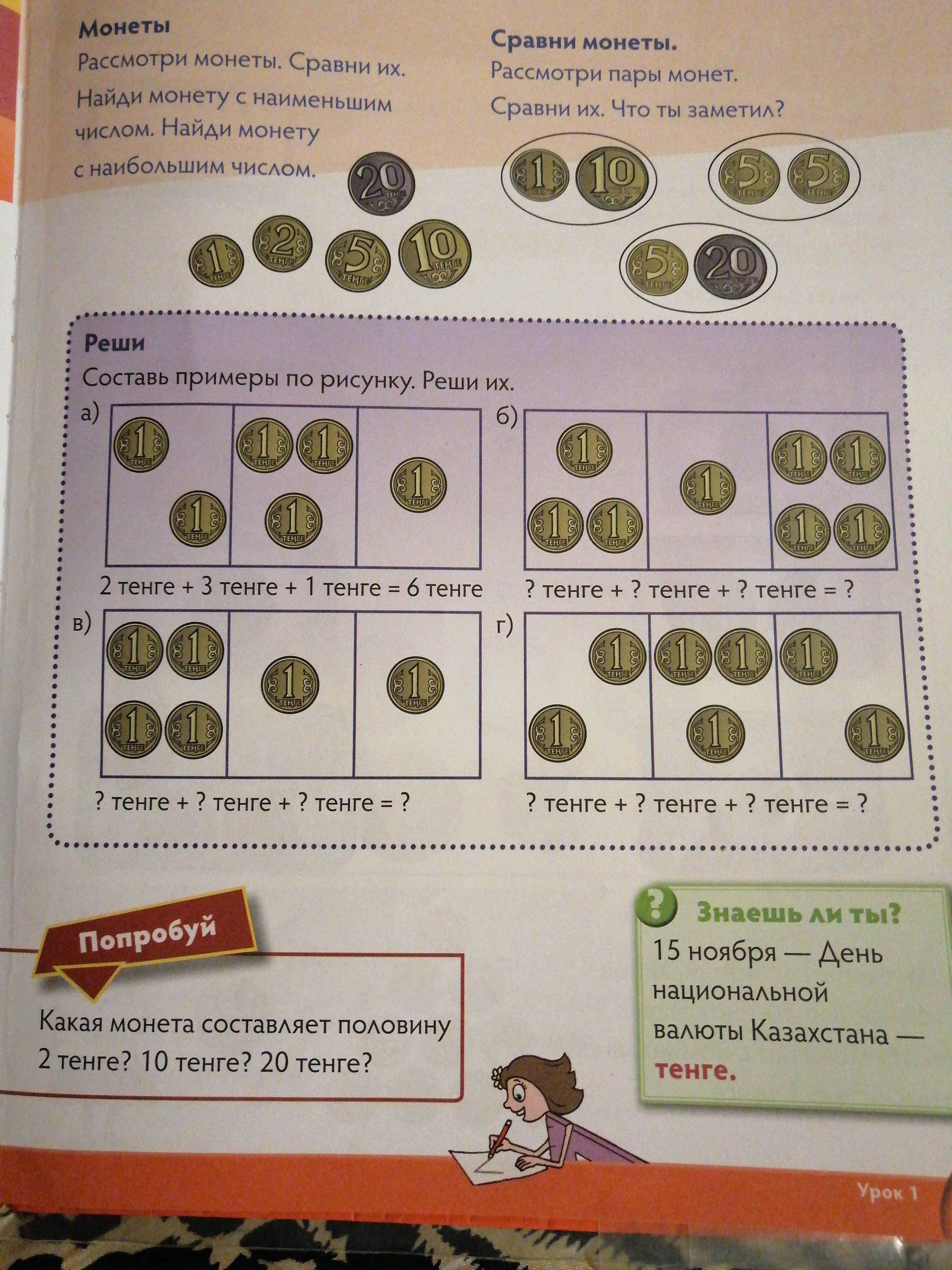 |4| Попробуй. Какая монета составляет половину: 2 тенге? 10 тенге? 20 тенге?