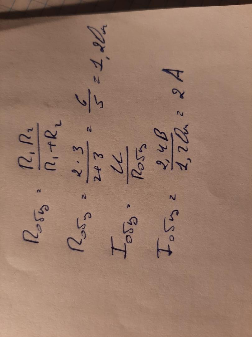 Проводники с сопротивлением 2ом и 3ом соединены параллельно и подключены к напряжению 2,4В. Найдите общее сопротивление цепи и общую силу тока.