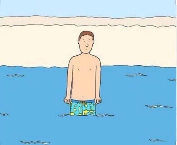 В этой картине не обнаружено горизонта и человек в море стоит очень высоко