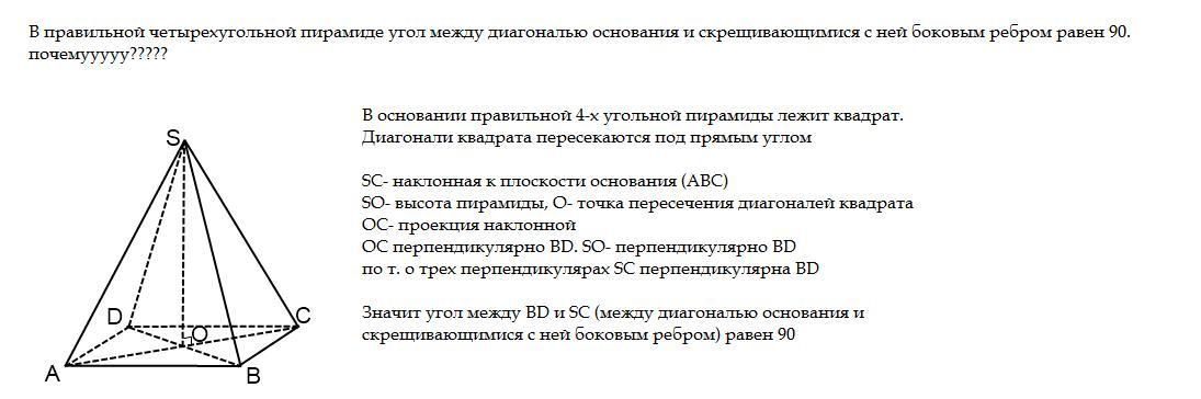 В правильной четырехугольной пирамиде угол между диагональю основания и скрещивающимися с ней боковым ребром равен 90.
