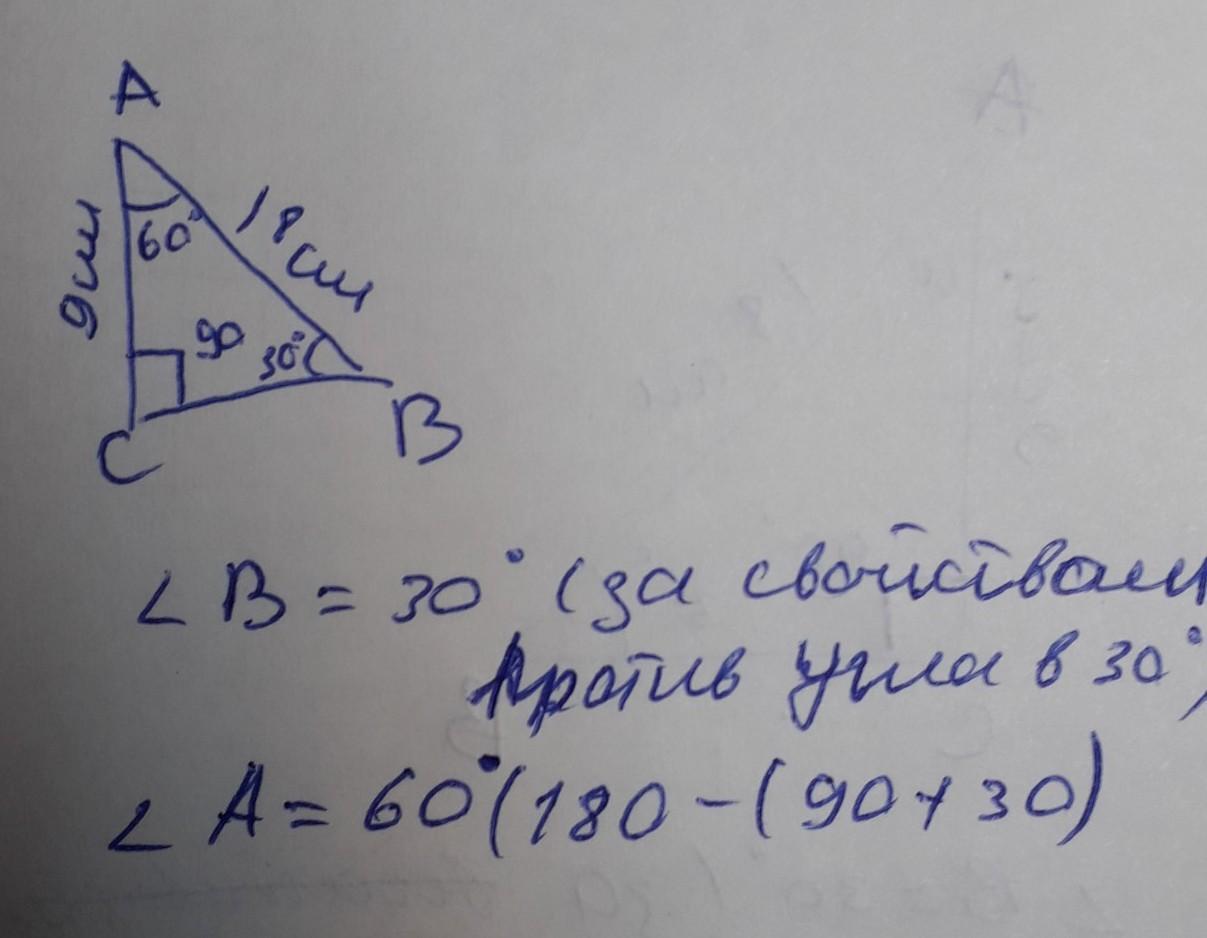 В треугольнике АВС с прямым углом С стороны АВ и АС соответственно равны 18 см и 9 см. Найдите величину большего острого угла треугольника.