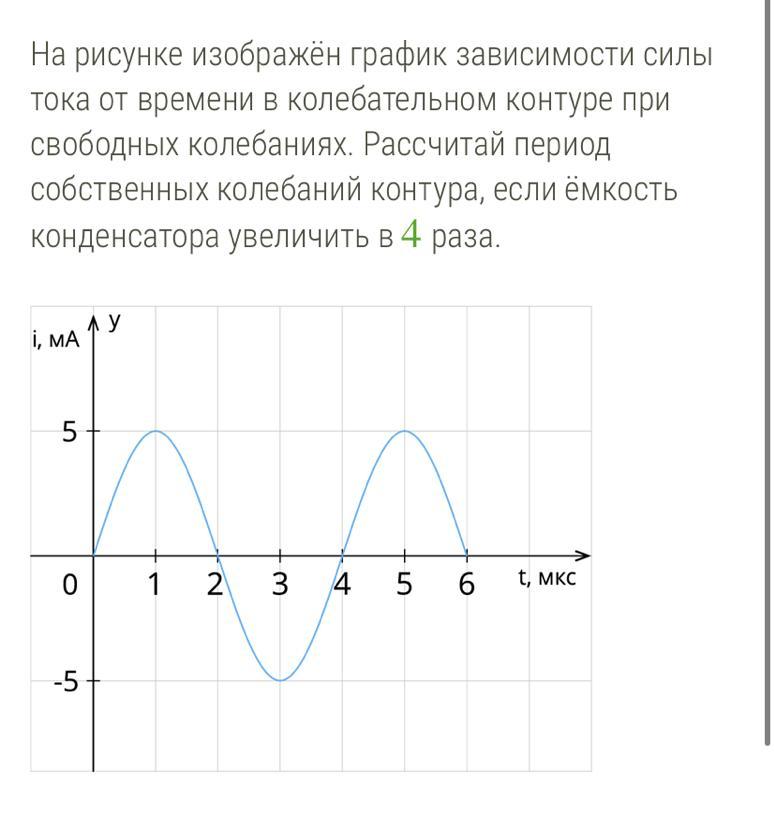 По графику зависимости силы тока в колебательном контуре от времени определим начальный период колебаний: T1 = 4 мкс.