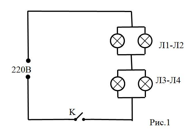 В осветительную сеть напряжением 220 В надо включить 4 одинаковых лампы, дающих полный накал при напряжении 110 B. Как соединить лампы, чтобы они не перегорели во время включения их в сеть?