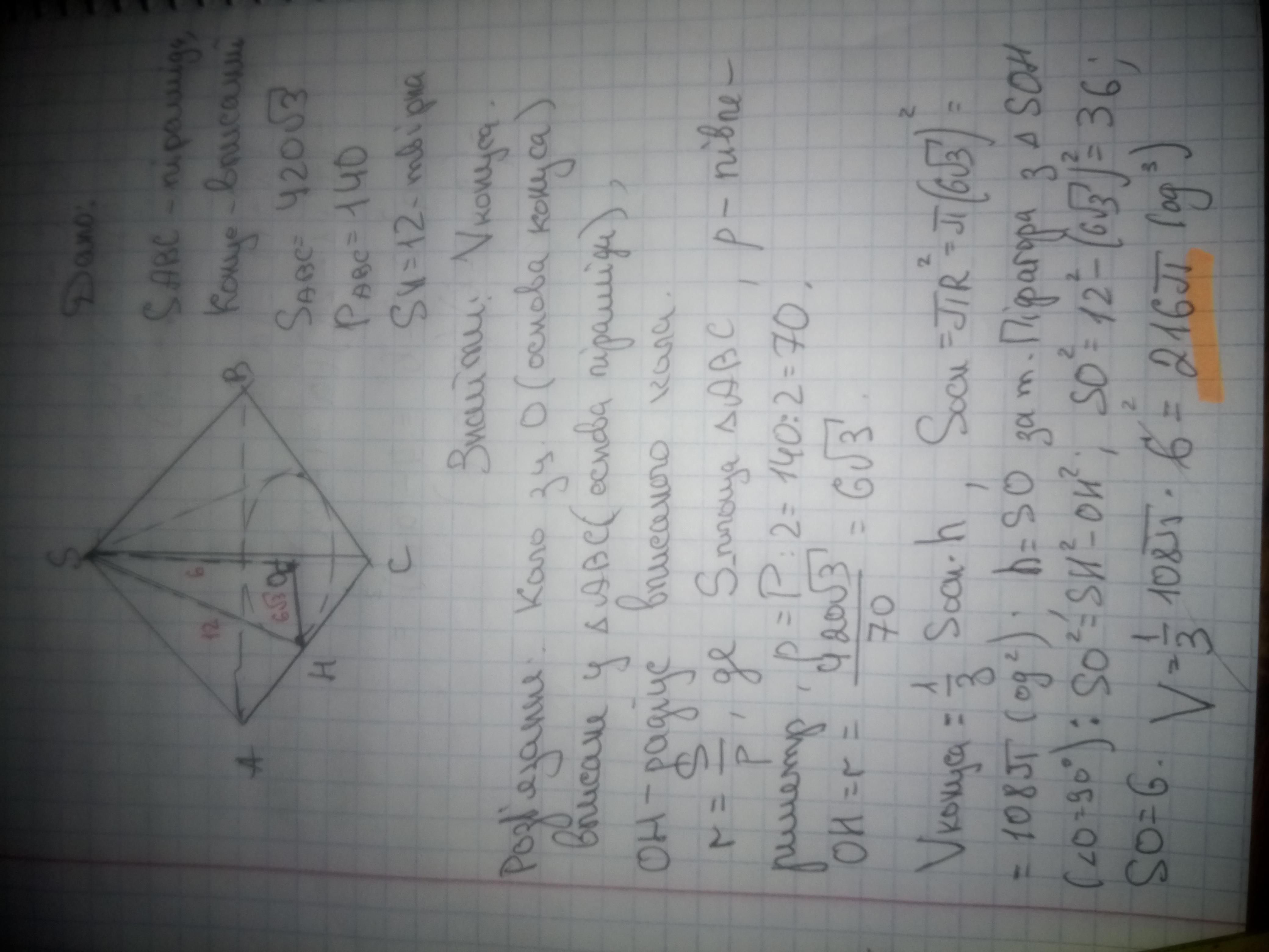 2. Навколо конуса описано трикутну піраміду, площа основи якої дорівнює 420√3, а периметр основи – 140. Визначте об’єм цього конуса, якщо довжина його твірної дорівнює 12., только с рисунком