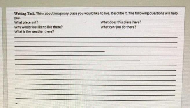 Ответ: My imaginary place is called "Alestra". I like it because anything I think about becomes true! The weather is always changing-like my feelings! But some creatures stay permanent, no matter what. There's four of them and they are all talking animals. We like to make up some sort of american slides, and then ride on them all day.