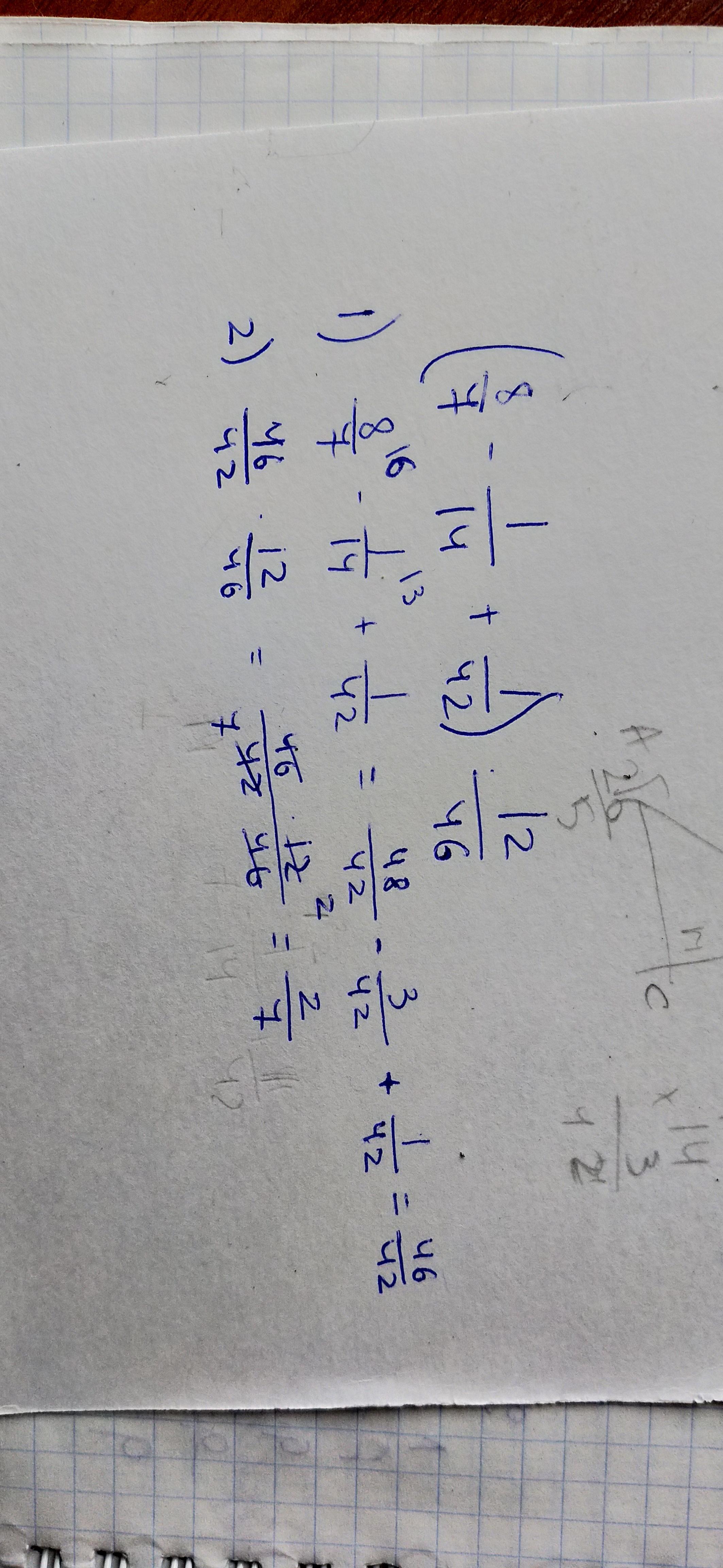 Сначала приводишь дроби в скобке к общему знаменателю. Ответ, что получился в скобке умножаешь на 12/46. 46 сокращается сразу, 42 и 12 сокращаются на 6. В итоге остаётся дробь 2/7