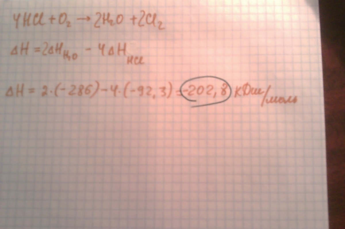 4HCl+O2=2H2O+2Cl2, исходя из теплот образования: