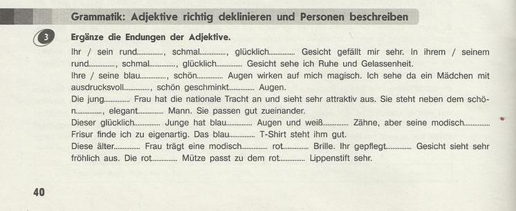 Ihr/ sein rundes, schmales, glückliches Gesicht gefällt mir sehr. In ihrem/seinem runden, schmalen, glücklichen Gesicht sehe ich Ruhe und Gelassenheit.