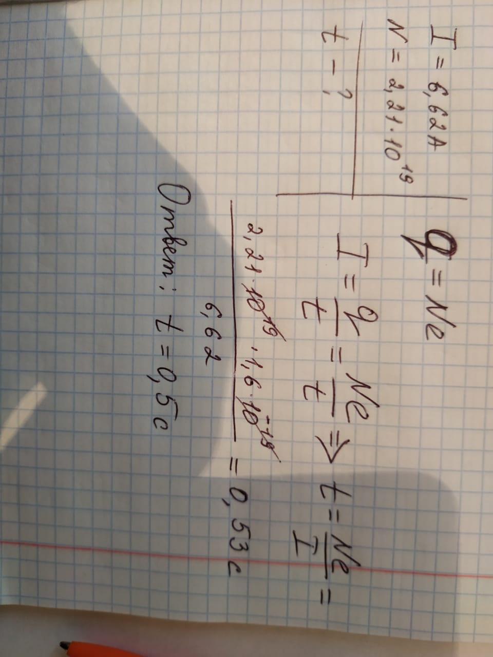 Сила тока в нагревательном элементе электрического обогревателя равна 6,62 А. За какое время через поперечное сечение нагревательного элемента проходит 2,21 ·10’19 электронов?