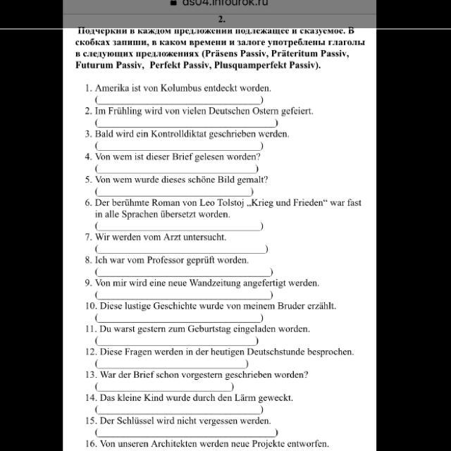 По немецкому дз подчеркните в каждом предложении подлежащие и сказуемое. В скобках запиши, в каком времени и залоге употреблены глаголы в этих предложениях