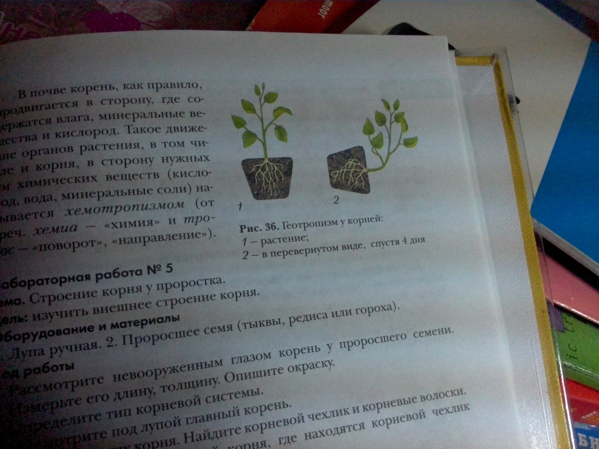 Используя рисунок 36 учебника , опишите , что произошло с корневой системой растения после того, как цветочный горшок положили набок. Как называется это явление?(геотропизм)