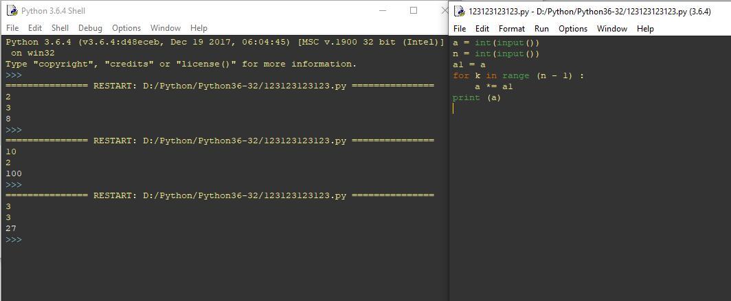 Мы вводим два числа и начинаем цикл While, в котором мы каждый раз когда делаем возведение в степень (умножаем число А на самого себя) уменьшаем число N (значащее степень, в которую надо возвести число)