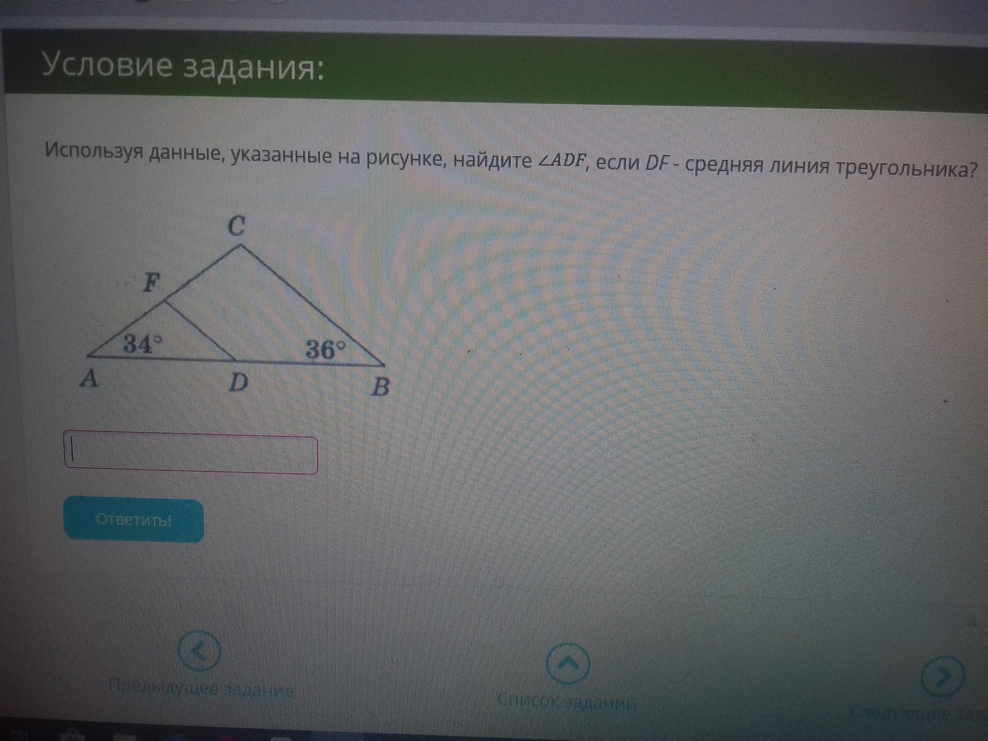 1. Т.к.DF- средняя линия ΔАВС, то DF║СВ, значит, ∠АDF=∠АВС=36°, как соответственные при DF║СВ и секущей АВ.