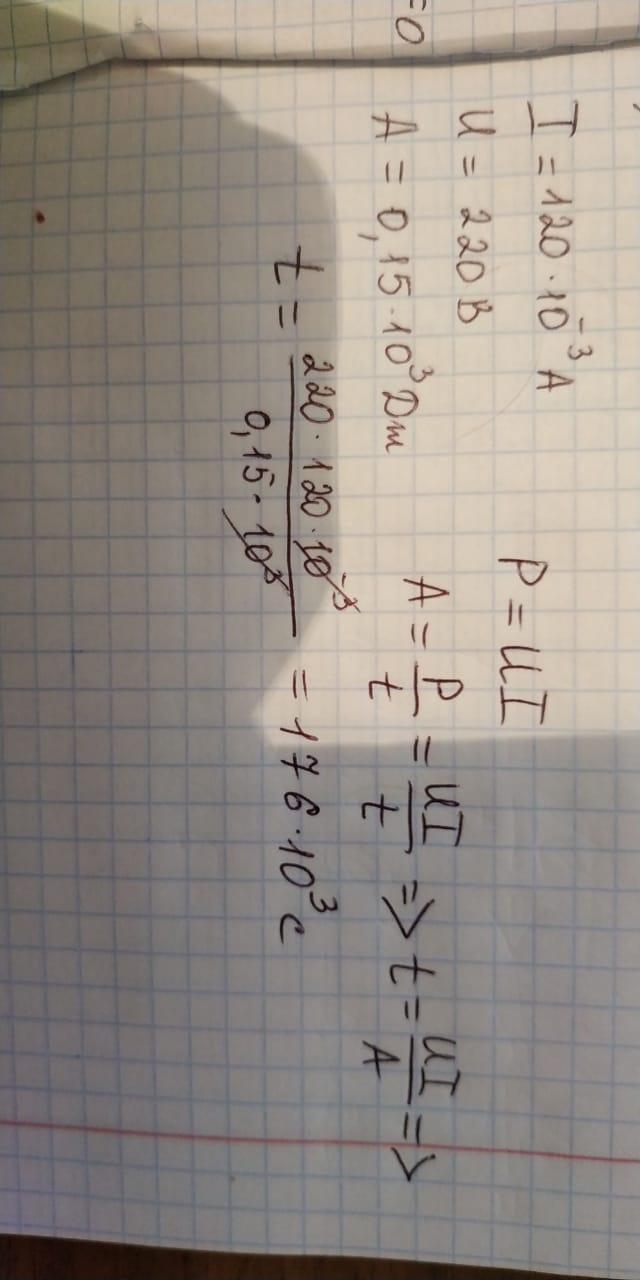 За какое время пройдет ток в проводнике в 120 мА при напряжении 220В , где совершается работа 0,15кДж ?
