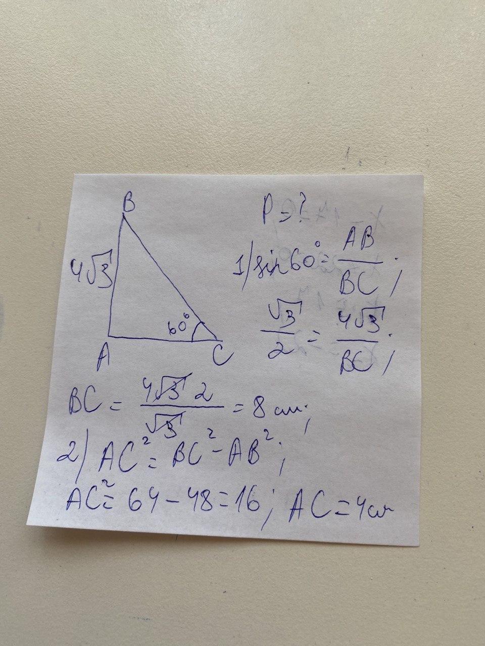 Катет прямокутного трикутника дорівнює 4√3 см , а протилежний до нього кут 60° . Знайдіть периметр трикутника.