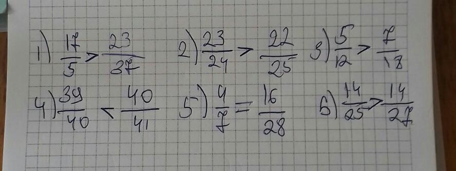 Сравните дроби: 17/5 и 23/37 23/24 и 22/25 5/12 и 7/18 39/40 и 40/41 4/7 и 16/28 14/25 и 14/27
