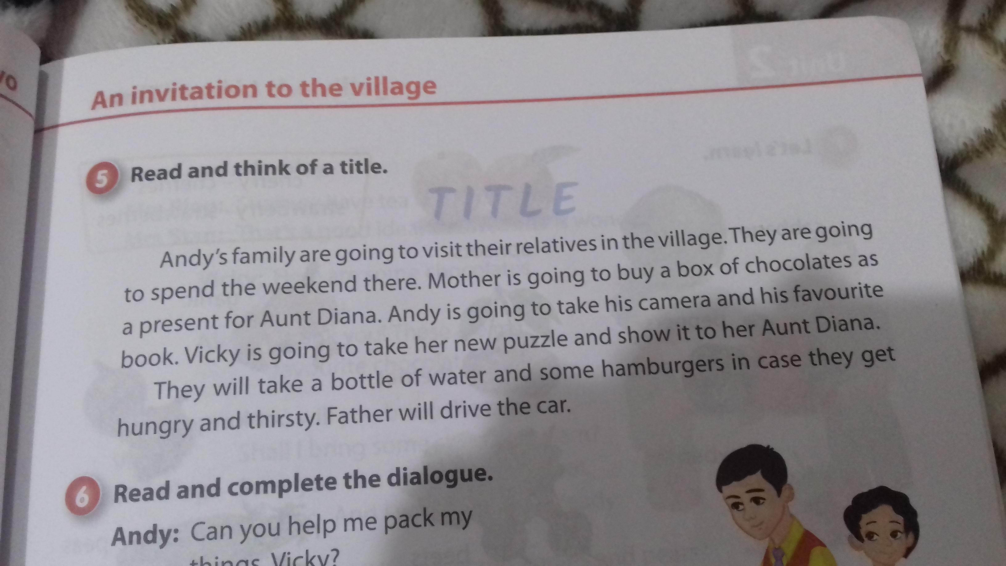 Перевод: Семья Энди собирается навестить своих родственников в деревне. Они собираются провести выходные там. Мама собирается купить коробку конфет в подарок для тети Дианы. Энди собирается взять свою камеру и свою любимую книгу. Вики собирается взять свою новую головоломку и показать ее своей тете Диане,