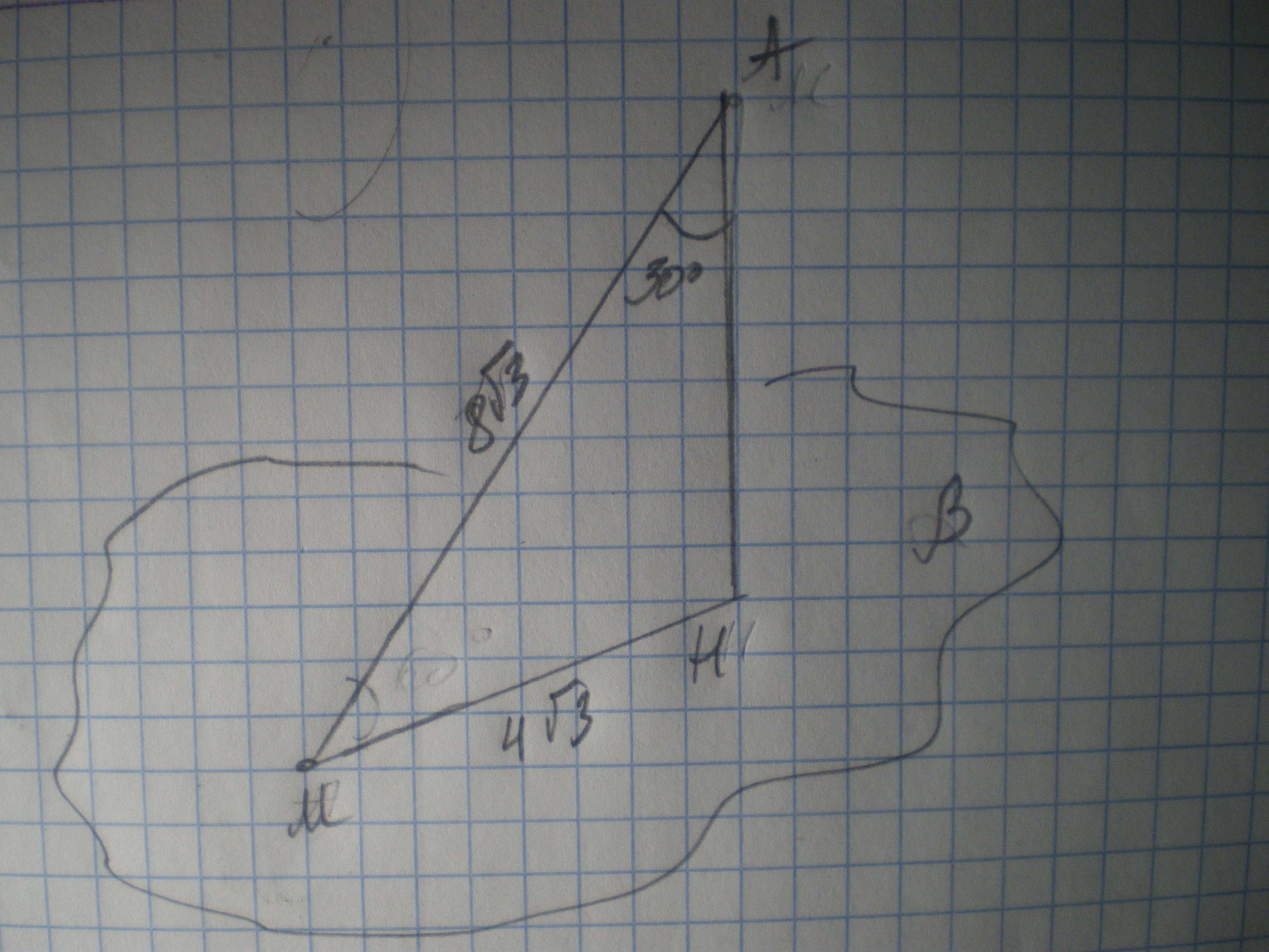 3 точки А к плоскости В проведено наклонную завдовжаы 8 корни 3 см и перпендикуляр, которые образуют между собой угол 30 °. Знвидить расстояние от точки А до плоскости