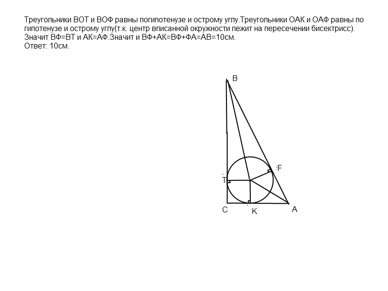 Окружность,вписанная в прямоугольный треугольник АВС с прямым углом при вершине С,касается сторон треугольника в точках F,T и K.Вычислите длину гипотенузы треугольника,если АК+ТВ=10 см.