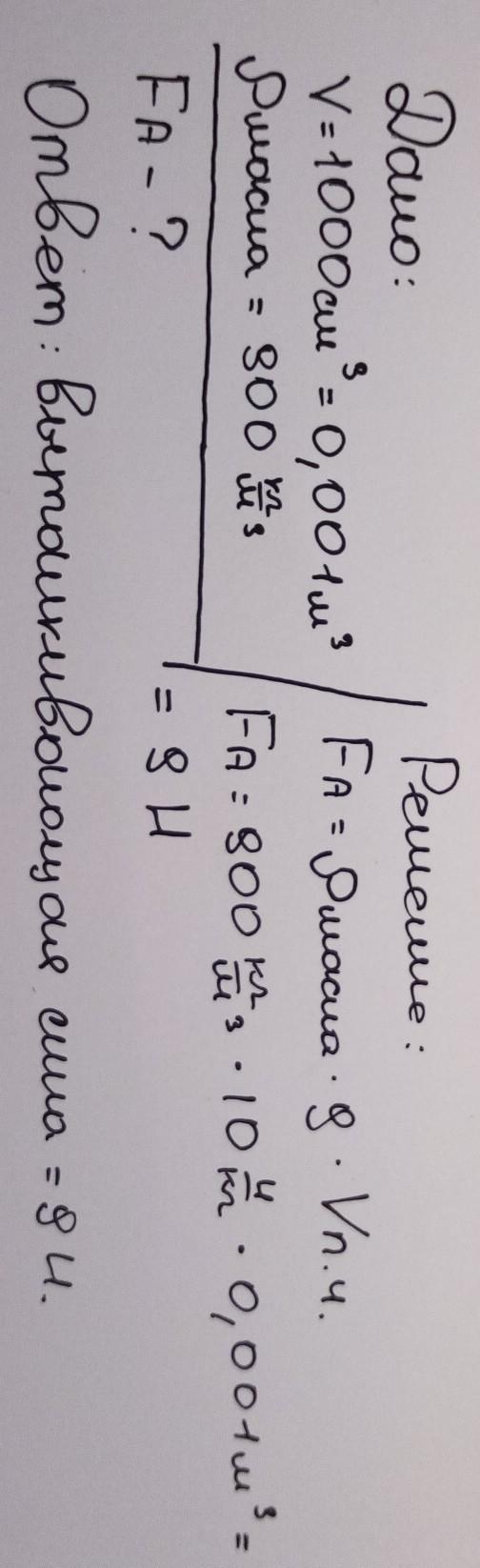 Вычислите архимедову силу, действующую на алюминиевую деталь объёмом 1000 см3, помещенную в машинное масло. Плотность машинного масла 900 кг/м3. Плотность алюминия 2700 кг/м3.